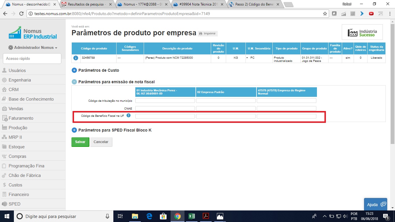 Passo 1) Escolher um produto e nos parâmetros de produto por empresa informar um "Código de benefício fiscal na UF" com 10 caracteres.