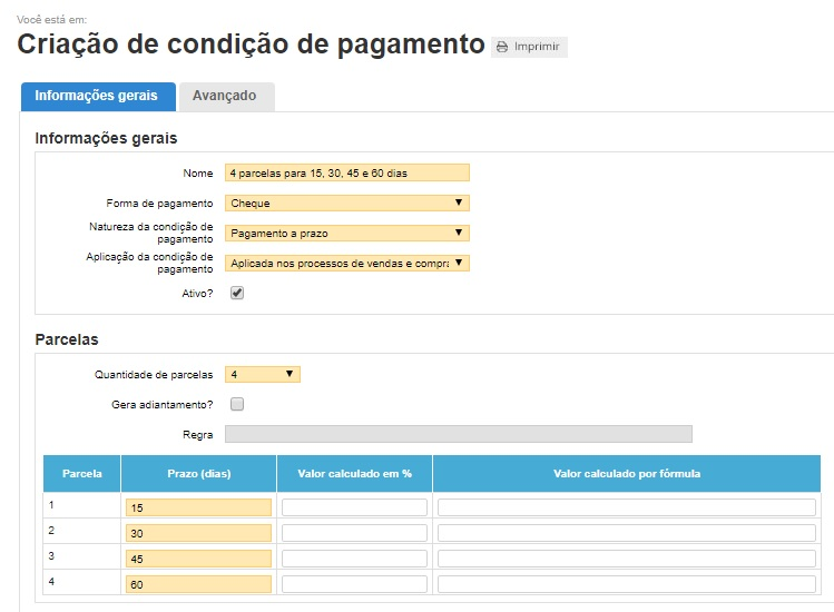 | Ativo | Marcar o campo para ativar a condição de pagamento |